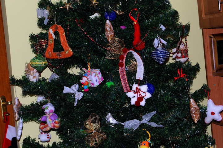 а ось наша "совина:)" ялинка. сама ялинка жива, але зроблена з гілочок.всі іграшки не бються, а більшість то совки пошиті з різних тканинок, ось так :)