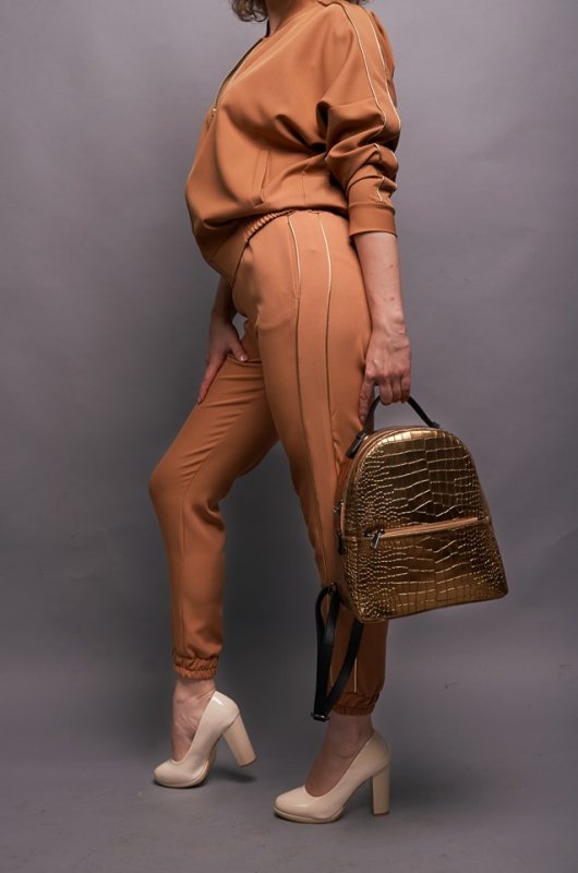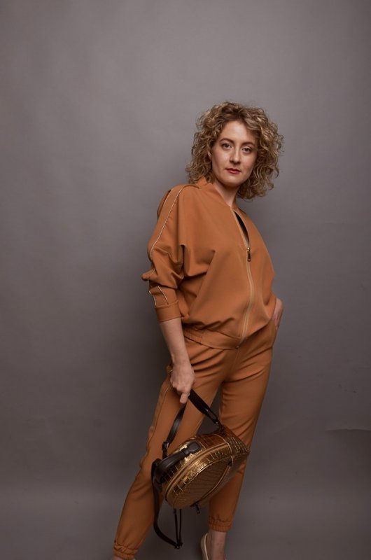 Спортивний образ з елегантною ноткою в карамельних тонах.