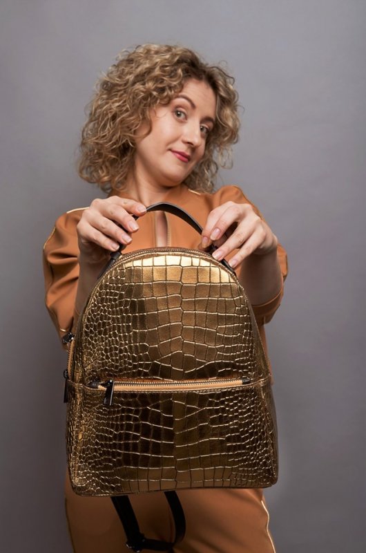 Акцент в образі - блискучий рюкзак з цікавою поверхнею.