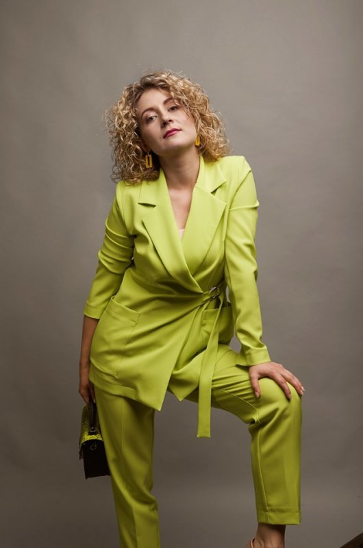 Яскравий, привабливий і діловий одночасно. Такий насичений жовто-салатовий колір може дозволити собі лише "весна"! На фото є два варіанти кульчиків, які сюди підходять. А яка сумочка!