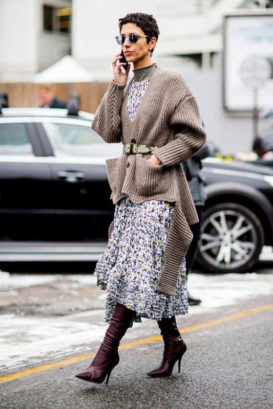 Сірий кардиган. Якщо колір базовий (він не обов'язково повинен бути сірим, якщо у вас теплий кольоротип, то можна вибрати бежевий або коричневий), то може бути нестандартним крій - об'ємні рукави, коротка довжина.